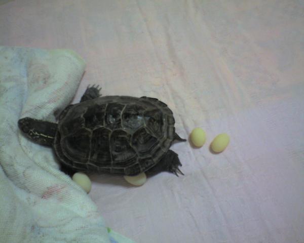 マイッタが白くなった水のなかにいるので、とりかえたところ、割れた卵発見。
